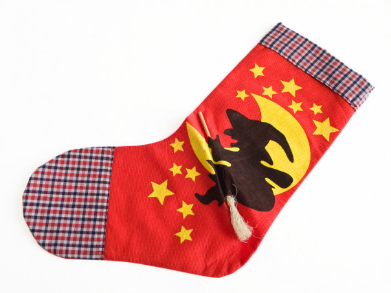 Cartamodello calza e silhouette Befana, resti di stoffa (rossa, gialla, nera, a quadri), spilli, colla a caldo, forbici, nastrino rosso