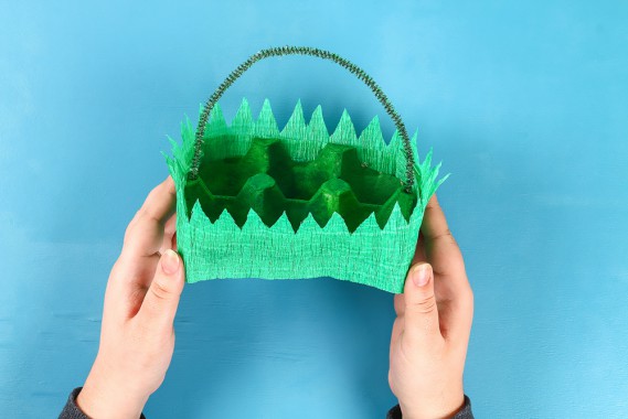 Riciclare un porta uova da sei pezzi, eliminare il coperchio e dipingerlo interamente con la tempera di colore verde. Poi ritagliare una striscia di carta crespa più alta dell’altezza del contenitore e incollarla intorno al cartone delle uova tagliando il bordo superiore a formare una serie di triangolini decorativi. Infine ritagliare un pezzo di cartoncino di riciclo e realizzare il manico che andremo a fissare ai lati del contenitore con due punti di spillatrice. A questo punto è possibile inserirvi le uova sode appena decorate, dipinte appositamente per l’occasione magari con l’aiuto dei bambini.