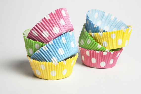 Pirottini da muffin in vari colori, forbici, filo di metallo, bastoncini da cake pop, nastro, colla a caldo, barattolo di vetro