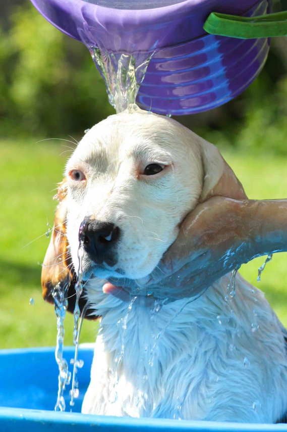 Per prima cosa evita di costringerlo con la forza verso la vasca o la bacinella dell’acqua. È opportuno cercare, invece, di persuaderlo parlandogli dolcemente, accarezzandolo, coccolandolo e distraendolo con qualche gioco. Una volta che è entrato nella vasca o nella bacinella, prima di procedere al lavaggio, assicurati che l’acqua sia alla temperatura giusta. Non deve essere fredda, ma allo stesso tempo non dovrebbe mai superare i 35°C. Bagnalo con una spugna, insaponalo con la mano e poi lavalo con un guanto da bagno o con una spazzola morbida. Non eccedere nell’impiego dello shampoo (che deve essere specifico per cani). Evita di mandare la schiuma negli occhi e nelle orecchie e, se il cane lo permette, usa la doccia per sciacquare, altrimenti munisciti di una caraffa e, versando l’acqua sul pelo, procedi al risciacquo.