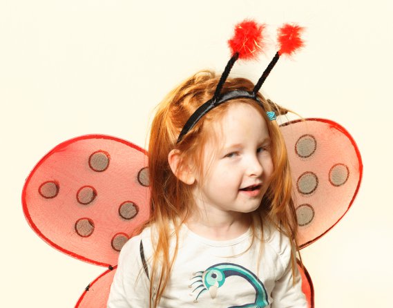 Servono un maglia e una calzamaglia nera. Ritagliate un cartoncino rosso a forma di ali aiutandovi con un cartamodello e applicate dei pois sempre di cartoncino nero incollandoli con la colla vinilica. Fate due fori due per lato, all'altezza delle spalle, poi fateci passare due cordoncini e fissate le ali sulle spalle come se dovesse portare uno zainetto. Sul capo mettete un cerchietto nero con due antennine fatte con due scovolini da pipa. Al top delle antenne incollate due cerchietti di cartoncino nero. Ai piedi stivali in gomma rossa.