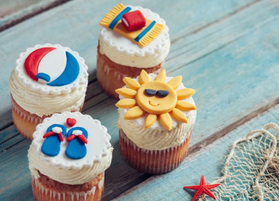 I cupcake si vestono d’estate con le decorazioni in pasta di zucchero. Con alcuni accorgimenti, infatti, il fondente si lavora anche nella stagione calda. Per le forme, possiamo guardare al mare, alle vacanze e agli splendidi colori della bella stagione.