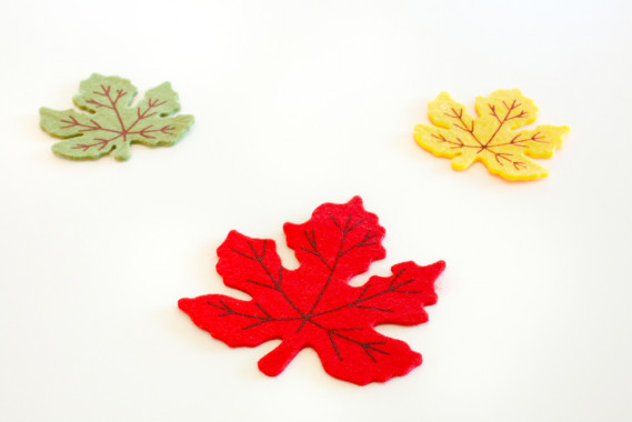 Cartamodelli di foglie, feltro di vari colori, ago e filo ocra, colla a caldo