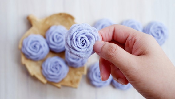 Arrotolare a formare il fiore e fissare l’estremità con un paio di punti, e la base con un po’ di colla.