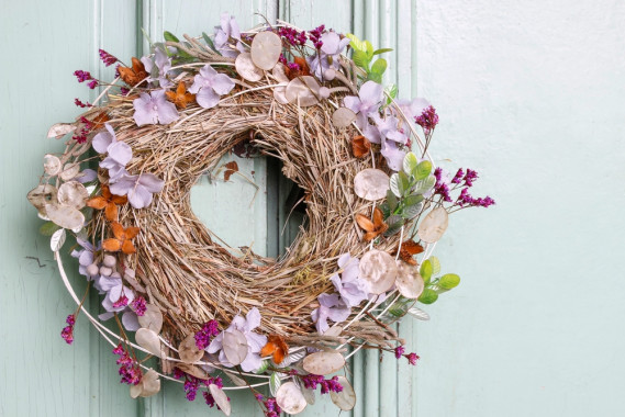 Le composizioni si adattano a diverse basi come la corona di polistirolo, quella fatta di vimini, il cerchio metallico, quello di cartoncino. Per il lavoretto, in base ai materiali, usa la colla a caldo o un’altra colla adatta o intreccia gli elementi.
