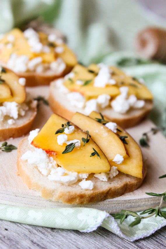 Le bruschette alle pesche e feta sono un antipasto originale nel periodo in cui troverai mature le nettarine.
