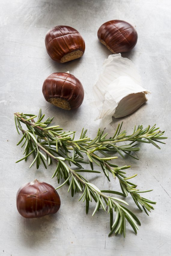 In una padella metti l'olio, i marroni (anche precotti), una manciata di rosmarino, un poco di sale e fai rosolare a fuoco moderato per 5 minuti; quando i marroni si saranno insaporiti, bagnali con un poco di brodo e lasciali cuocere per più di un'ora a fuoco lento, se sono crudi, soltanto 15 minuti se sono già cotti.