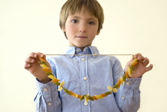 Scegliamo e coloriamo come formato di pasta i ditalini e realizziamo infilando i chicchi in un filo di lana o nylon. I bimbi più piccoli possono usare i ditaloni o le mezze maniche.