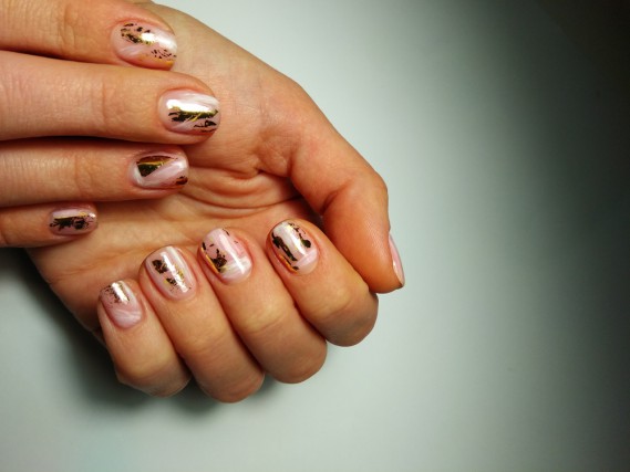 Se non vogliamo esagerare e ci piace un tocco più leggero che possa ben accordarsi con abiti e accessori basta utilizzare un pennellino e l’oro sono per pois o un paio di righine a unghia. Oppure passare un velo di rosa ed effettuare un bordino dorato dando vita a disegni astratti solamente su parte dell’unghia.