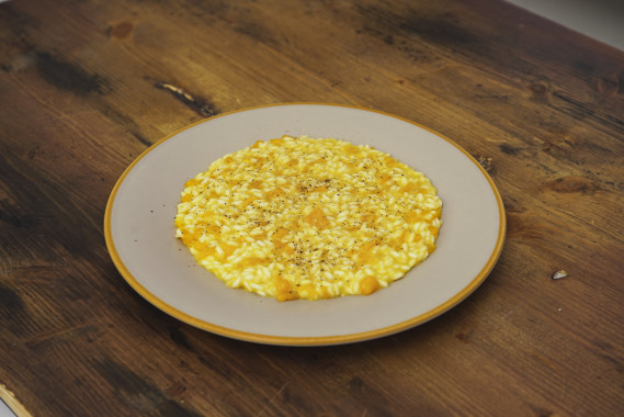 Soffriggere la cipolla con un cucchiaio di olio e 10 g di burro. Aggiungere i cubetti di zucca e il riso. Tostare il riso per qualche minuto e sfumarlo con il vino bianco. Iniziare la cottura del risotto aggiungendo poco per volta il brodo. Mantecare il risotto con burro, parmigiano e una spolverata di pepe.
