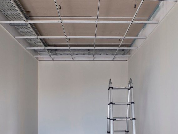 Quindi, puoi posare i pannelli di cartongesso. Per rifinire il controsoffitto, applica l’apposito nastro sulle giunture, stucca il cartongesso e tinteggia.