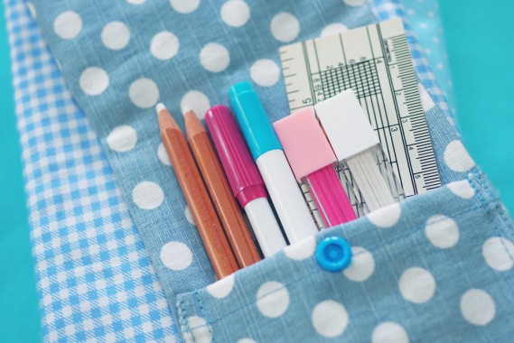 Basta inserire penne e matite, arrotolare su se stesso il tessuto e fissare il tubo con gli elastici.