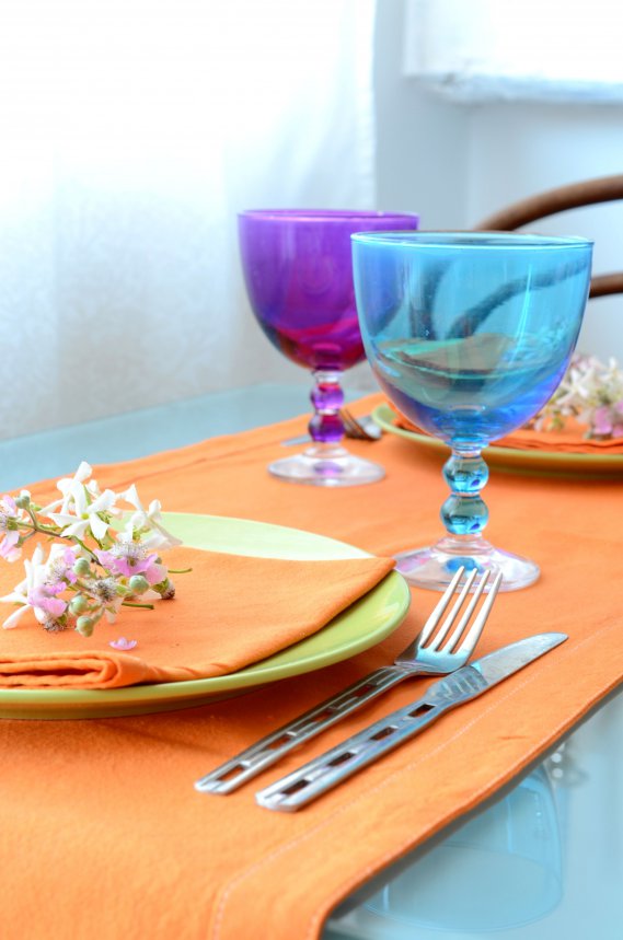 Per iniziare, ho scelto dei vecchi runner beige e dei tovaglioli un po’ datati. Da tempo erano nell’armadio per via del loro colore un po’ spento e anonimo. Tra le varie tinte a disposizione nella gamma Coloreria, ho scelto un arancio pastello che ben si adatta per una apparecchiatura briosa e colorata. A vederlo ora, a me sembra nato proprio così e sono certa che nessuno immaginerebbe il suo passato beige, non credi?
