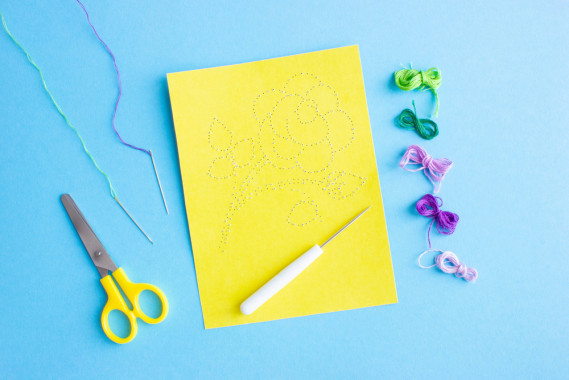 Poi da sotto, inserire nel terzo foro, poi tornare ad in filare l'ago dall'alto nel secondo foro. Ripetere il procedimento nei tre fori successivi, e così via, fino a ricamare tutto il disegno. Infine piegare in due il biglietto, e completare inserendo all'interno gli auguri per la Festa della mamma.