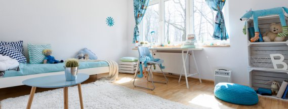 Le camerette dei bambini rischiano di essere sommerse da giochi e oggetti piccoli. Tuttavia, un unico mobile può occupare spazio, perciò sfruttiamo mensole e contenitori bassi, anche fai da te e realizzati con materiali di recupero.