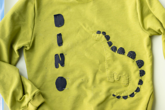 3) Applica le sagome sulla maglietta e, se ci sono dei piccoli particolari, fissali sulla figura principale. Come fare? Puoi scegliere di cucire le decorazioni, provare a incollarle con una colla idonea non tossica, applicare una tela termoadesiva sui ritagli e fissarli con il ferro da stiro, come puoi vedere qui.
