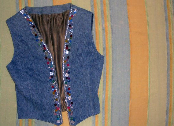 - Ad esempio, lungo il profilo del davanti del gilet di jeans, puoi cucire una fila di strass o paillette color ghiaccio o argento.