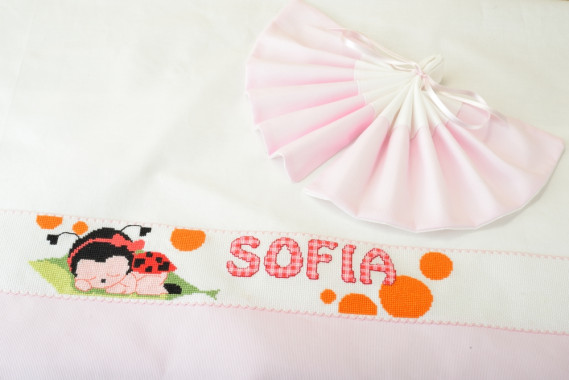 3) Una terza opzione è ricamare il nome con il punto a croce, dunque tracciando le crocette con ago e filo. In questo caso, puoi scegliere uno schema e riprodurre le lettere sulla tela aida o su un altro tessuto aiutandoti con il canovaccio apposito. Per tutti i consigli e gli schemi, leggi qui.