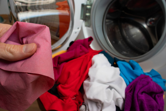 Non appena scopri che si è verificata una macchia nella lavatrice, trova il colpevole (tessuto o carta, perché spesso i fazzoletti lasciati nelle tasche) che ha causato il danno ed estrailo dalla lavatrice.