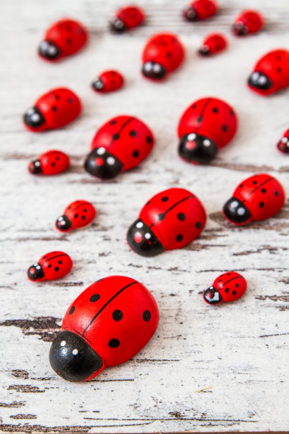 Prima di completare il lavoro studia bene il rapporto tra colori e decorazioni. Fissa quindi le coccinelle e incollale nella posizione predefinita in modo da ottenere una decorazione armoniosa e ben fatta. Aggiungi decorazioni o disegni di erba e fiori per completare l’effetto primaverile.