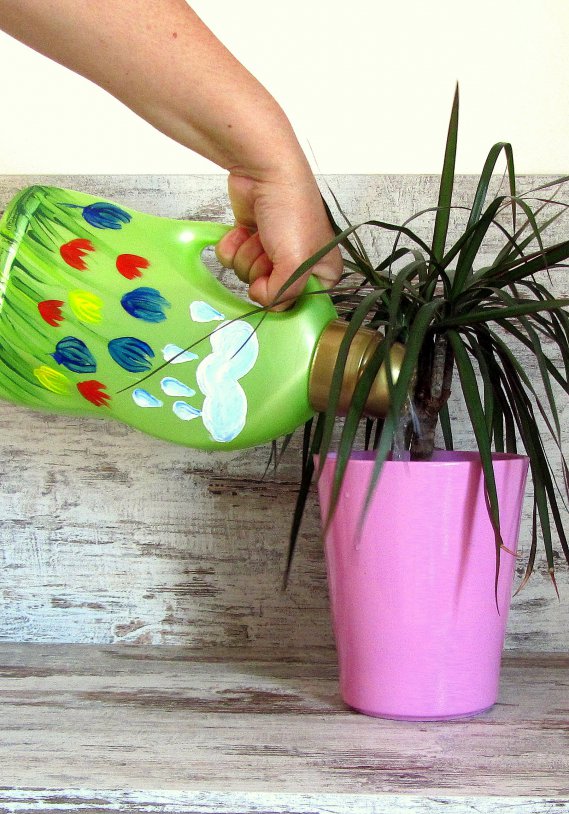 Con i flaconi che hanno un bel collo largo, un tappo ampio e la maniglia sul lato mi sono ingegnata: sono sempre coloratissimi e hanno la forma giusta per essere riutilizzati in giardino o in terrazza, ho cominciato a creare ed è nato il primo annaffiatoio.
