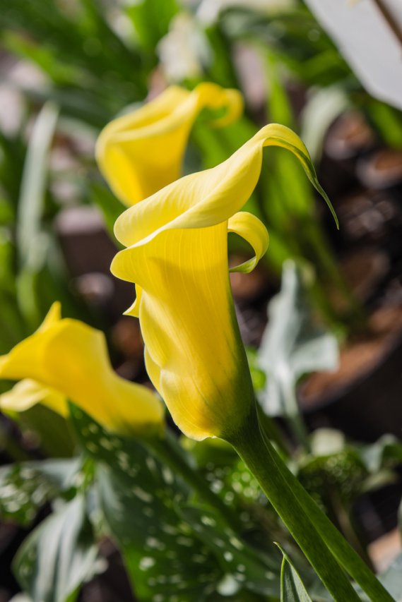 Rizomatosa perenne la calla è una pianta delicata, di taglia media. I fiori sono solitari, leggermente profumati, formati da un asse centrale, lo spadice ed un’unica foglia, la spata, che lo avvolge ad imbuto. Fiorisce per tutta la stagione estiva, le foglie sono voluminose, verdi o maculate di bianco.