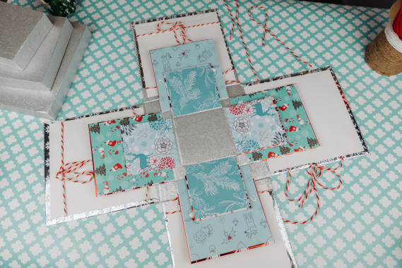 Quando tutte le croci sono pronte, incollale al centro. Quindi, per l’explosion box fai da te, pensa alle decorazioni interne: su ogni faccia, puoi incollare foto, sagome pop up, nastrini, pergamene arrotolate, merletti, buste che contengono biglietti e così via, seguendo la tua fantasia e creatività.