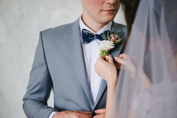 Il fiore va inserito nell’asola e appuntato con uno spillo da sotto al risvolto della giacca alla sinistra dello sposo.