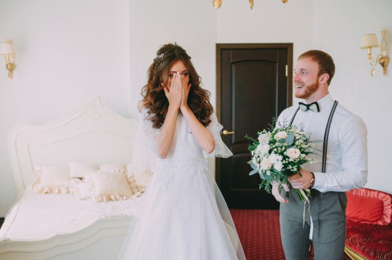 3) Le modalità: per questo chiedi consiglio al fotografo o fatti ispirare dalla rete. Potete ritrovarvi uno di fronte all’altra con gli occhi chiusi oppure uno dei due aspetta l’altro e si gira o trovare un modo originale per la sorpresa della prima volta in abiti nuziali.