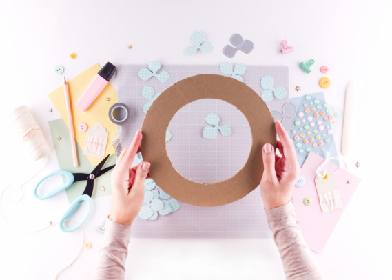 Intanto preparare lo scheletro della ghirlanda con Il cartoncino. Ritagliare una sagoma circolare prendendo come modello una ciotola per la pasta e realizzare un cerchio interno.