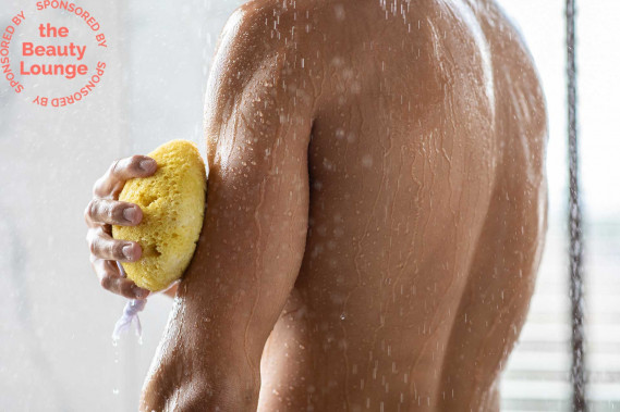 - Iniziamo con una spugna morbida, magari che faccia anche lo scrub, perché anche gli uomini hanno bisogno di eliminare le cellule morte e far respirare la pelle.