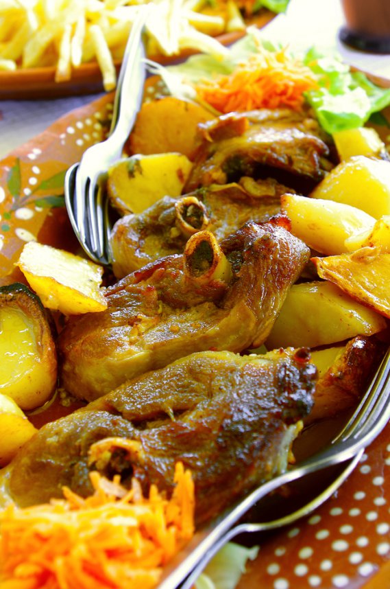 Metti la teglia in forno a 180°C. Dopo 30 minuti, gira bene i pezzi di carne e aggiungi le patate sbucciate e tagliate a spicchi oppure delle patatine novelle, mescola e prosegui la cottura per altri 30 minuti.