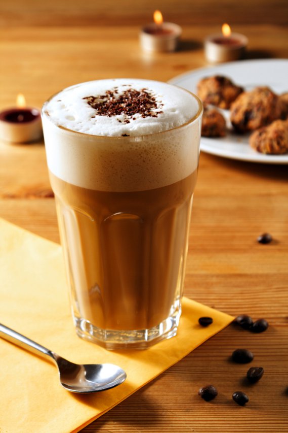 È semplicemente una tazza di caffè nero con una generosa aggiunta di latte scaldato con tanta schiuma come un cappuccino, perciò monta il latte caldo con un frustino o – se la possiedi – con l’apposita macchinetta per il latte.