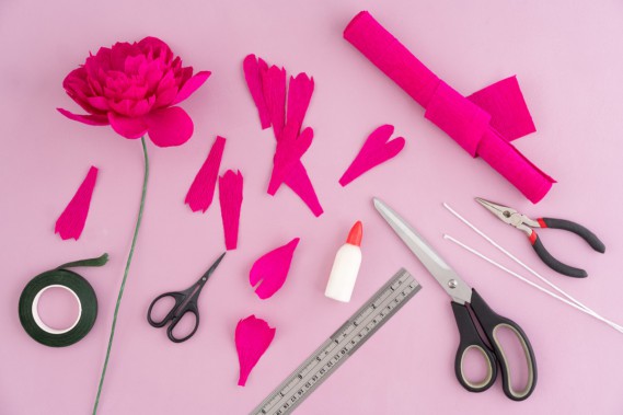 Fissiamo una striscia di nastro carta al centro e iniziamo ad aprire il nostro fiore di carta crespa con le dita, lavorandolo con i polpastrelli. La nostra peonia è pronta e può diventare parte di un ben cartellone tridimensionale a tema floreale o anche una decorazione per un pacco regalo.