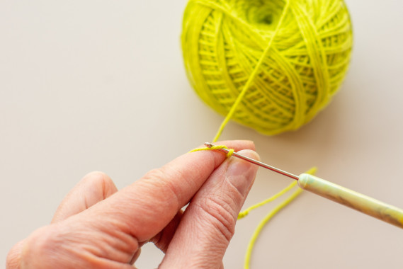 - Fai 3 catenelle e prosegui con 1 maglia alta in ogni punto, quindi chiudi il giro con una maglia bassissima. Ripeti la lavorazione per ogni giro.