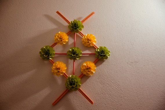 Nella fase successiva occupati della base per appendere i fiori lavorando delle strisce di carta di giornale di 14x40 cm. Arrotola la prima partendo da un angolo e continua fino all’angolo corrispondente realizzando delle bacchette. Incolla l’estremità. Fai la stessa operazione per otto volte e incolla in coppia e a quadruccio le otto stecche. Usa la colla a caldo per realizzare delle composizioni con i fiori sistemandoli seguendo il proprio estro creativo.