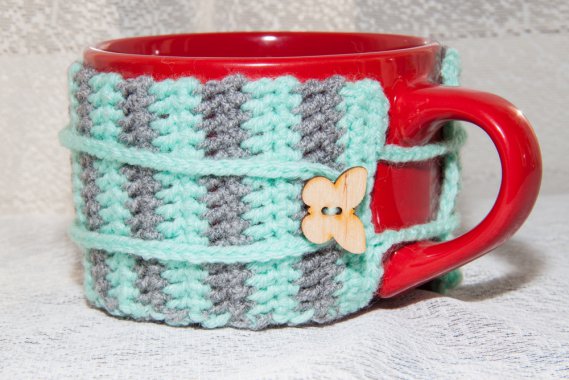 Per una versione molto semplice del copri tazza, basta fare una striscia, ovvero partire con una fila di catenelle e continuare con la maglia bassa o alternando maglia bassa e maglia alta. Alla fine, su un lato aggiungiamo l’occhiello con le catenelle; sull’altro, alla stessa altezza, cuciamo il bottoncino.