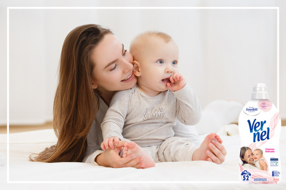 Adesso arriva il momento dell’ammollo: sciogli nell’acqua il detersivo. In questo caso ci vuole un detergente delicato per bambini come Bio Presto Baby, il detersivo liquido per lavatrice perfetto anche per il bucato a mano e particolarmente delicato sulla pelle dei bambini perché dermatologicamente testato. Dopo aver lasciato la tutina in ammollo per due ore, il gioco è quasi è fatto: sciacqua accuratamente la tutina e falla sgocciolare. Poi riempi nuovamente la bacinella o il lavello aggiungendo l’ammorbidente. Quello che serve è un ammorbidente ipoallergenico e dal profumo delicato come Vernel Carezza Delicata.