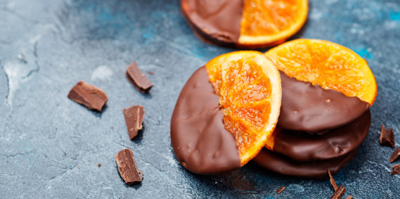 Sbucciare un’arancia, tagliarla a fettine abbastanza sottili e disporle in un piatto. Mescolare in una tazza un cucchiaio di marmellata d’arancia, un cioccolato fondente dopo averlo fuso a bagnomaria e un paio di noci sbriciolate. Spalmare con l'aiuto di un coltello. Lasciare rapprendere lil top delle arance qualche minuto, prima di consumare.