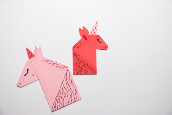 Di seguito piegare le due metà della forma verso la riga invisibile centrale a formare un rombo. Infilare le due punte nella taschina del triangolo rovesciato, tagliare un triangolino centrale di circa 1cm di lato e stondare i vertici di base. Tagliare 6 rettangolini di carta di colore diverso e sfrangiarli. Incollarli sul lato sinistro del triangolo come sfiziosa criniera. Con la carta glitter dorata realizzare il corno e incollarlo sull’altro lato.