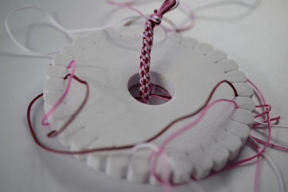 Prendiamo il coperchio di un barattolo come modello per tracciare un cerchio (di 11 cm diametro), poi ritagliamo il cerchio. Al centro tracciamo un cerchietto di 2cm diametro per creare un foro. Facciamo dei tagli con le forbici in corrispondenza dei quattro punti cardinali e poi altri 4 tagli tra quelli fatti, poi altri 8 e ancora, fino ad avere 32 tagli a disposizione sul telaio. Partiamo da un tutorial base usando solo 8 tagli e fili da ricamo: sarà divertente per fare un po’ di pratica prima di imbarcarci in modelli e lavori più complessi. Poi non resta che infilare i fili e intrecciare. È possibile numerare i tagli (da 1 a 32) soprattutto se dobbiamo seguire un modello particolarmente complesso. Sul web trovimo svariati schemi di differenti livelli di difficoltà.